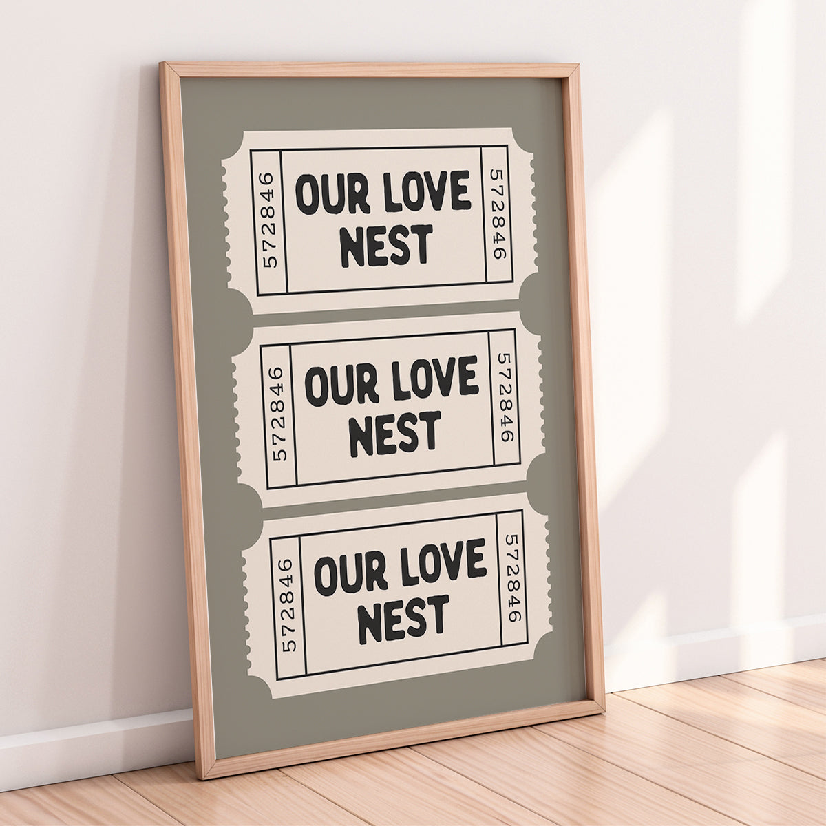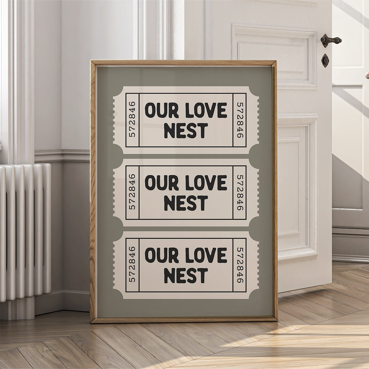 A charming retro style ticket stub print featuring the sweet phrase “Our Love Nest”. Designed with vintage inspired borders and hand drawn lettering, this print brings warmth and personality to bedrooms, living spaces or cosy couple corners.