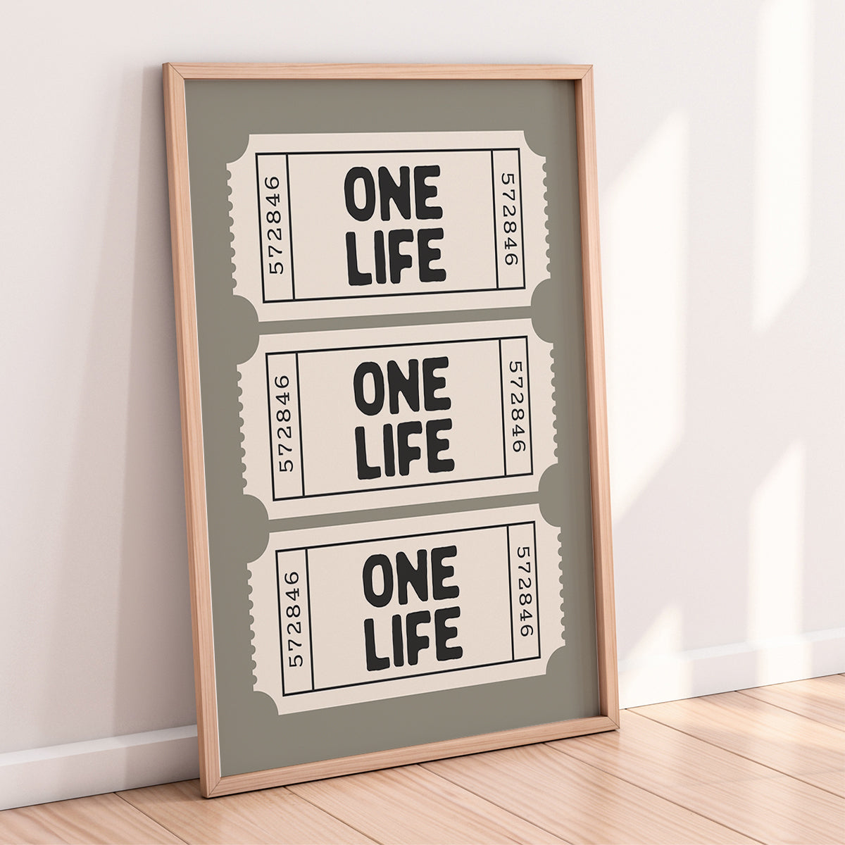 A bold retro ticket stub print featuring the motivational phrase “One Life”. Designed with hand drawn lettering and a classic vintage ticket layout, this uplifting print is a stylish reminder to live fully, stay inspired and make every day count.