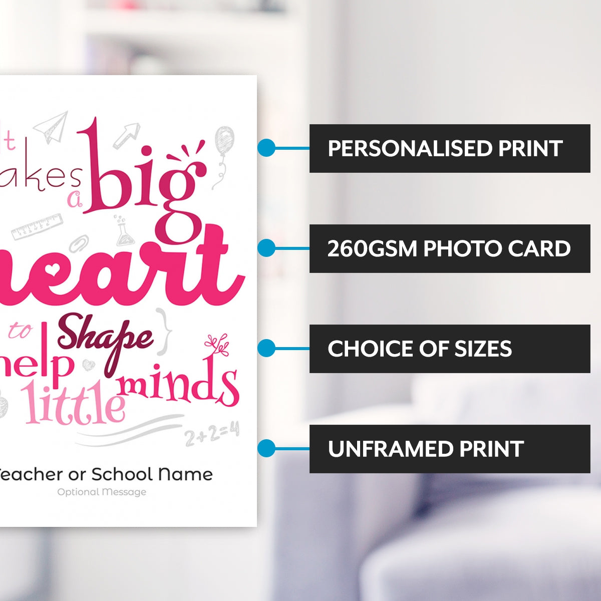 Buy this big hearts word art print today. The teacher print can be given as a gift to a teacher, teaching assistant or nursery worker at any school, nursery or even play group. It's produced in full colour, with branded inks and on luxury photo paper for a high quality finish.