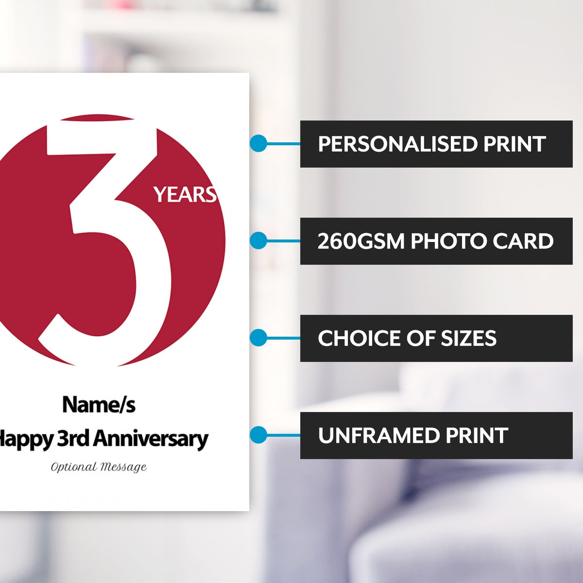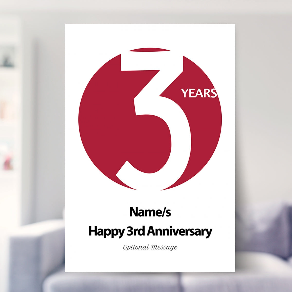 This unique wedding anniversary print is from our Circle design range. A very eye catching design which shows the number of years married along with the couples names, short message at the bottom and "Happy 3rd Anniversary".