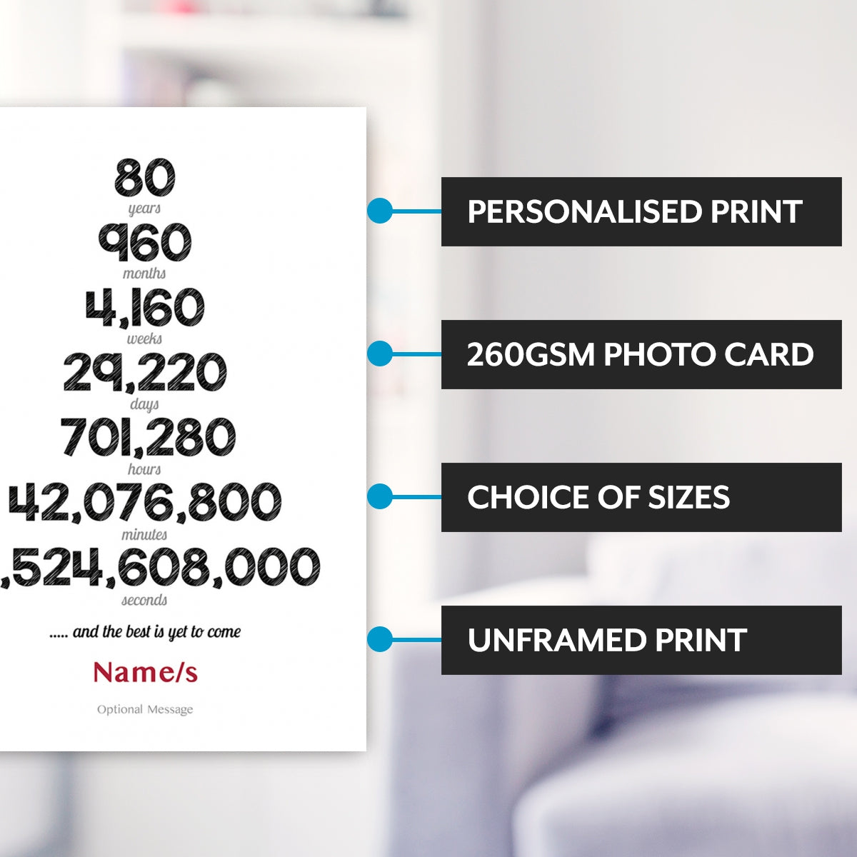 It can be changed to suit any anniversary, all you need to do is let us know the number of years. The print will be produced in full colour, with branded inks and on luxury photo paper for a high quality finish.