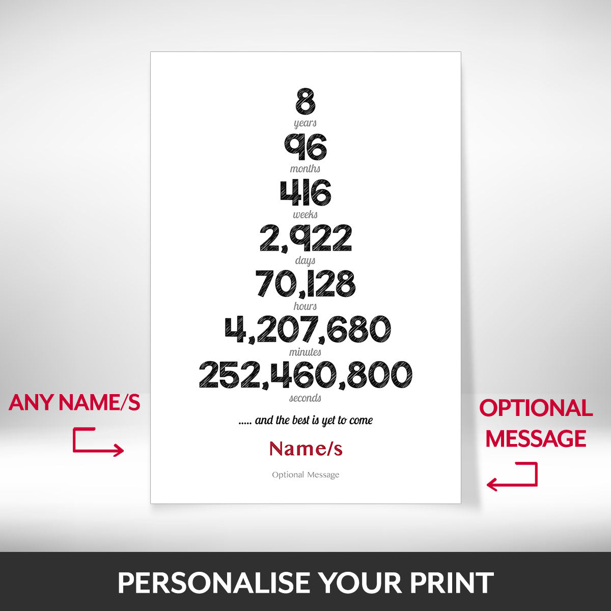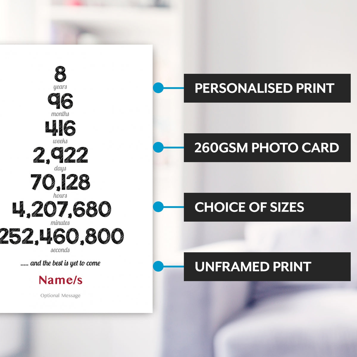 If you're looking for a unique wedding anniversary gift then this could be what you need. This stunning personalised print shows the length of time in number from years to seconds.