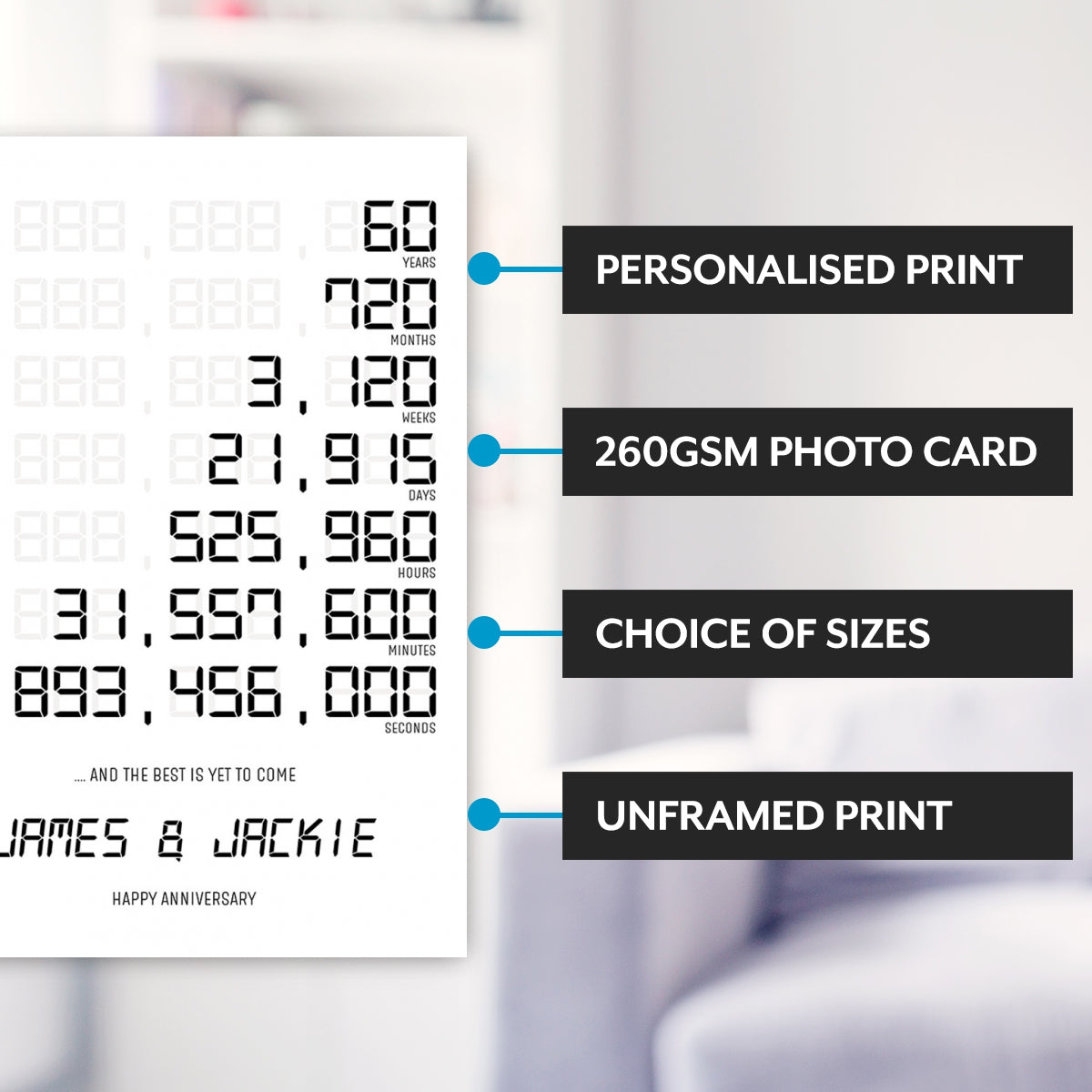 It can be changed to suit any anniversary, all you need to do is let us know the number of years. The print will be produced in full colour, with branded inks and on luxury photo paper for a high quality finish.