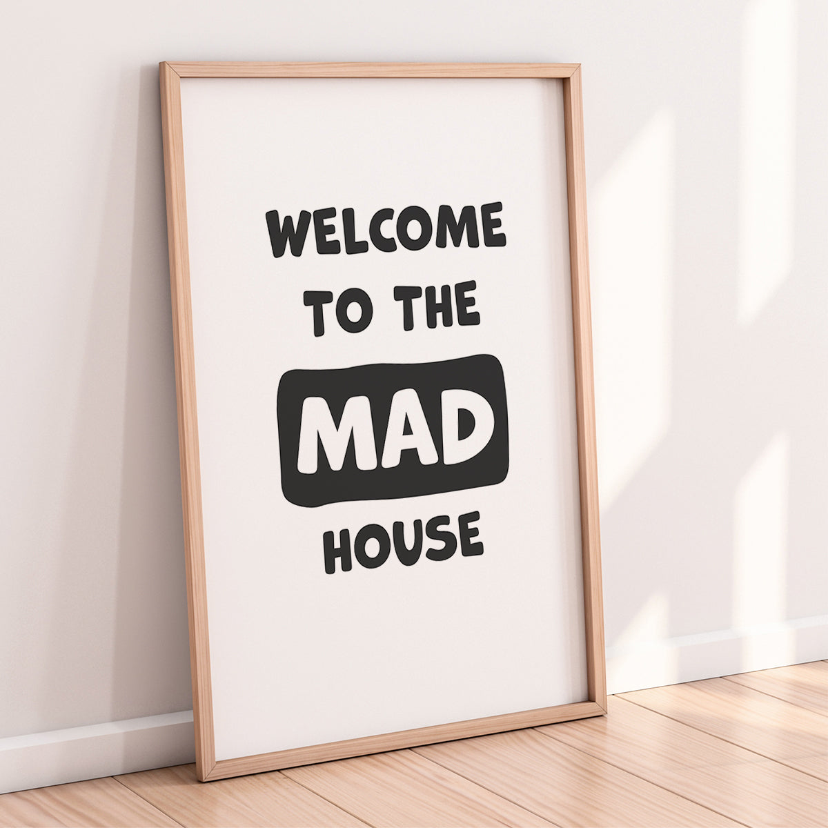 A bold, playful and modern wall art print featuring the fun family phrase "Welcome to the Mad House". Designed in a clean black-and-white style, this print adds personality and humour to any busy home. Add an optional personalised message to make it unique to your family.